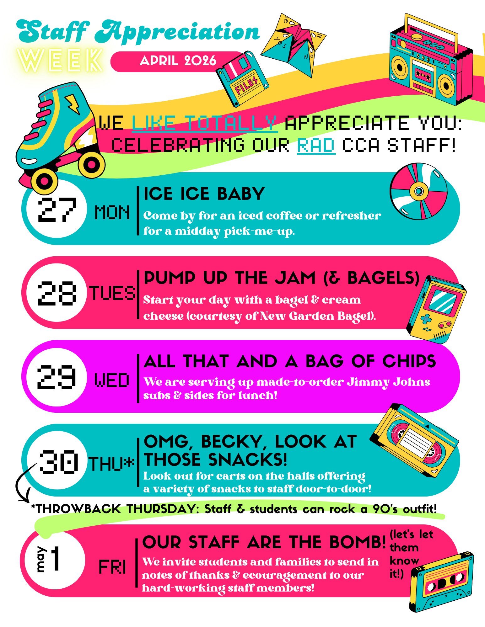 Thursday, we’ll celebrate Throwback Thursday—students and staff are invited to dress in their favorite 90s gear, with snacks provided.